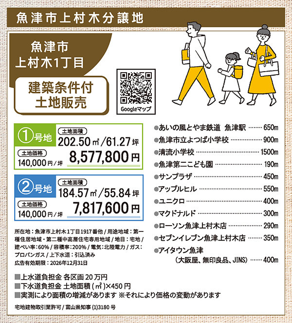 魚津市上村木1丁目に土地を販売いたしております(建築条件付)。