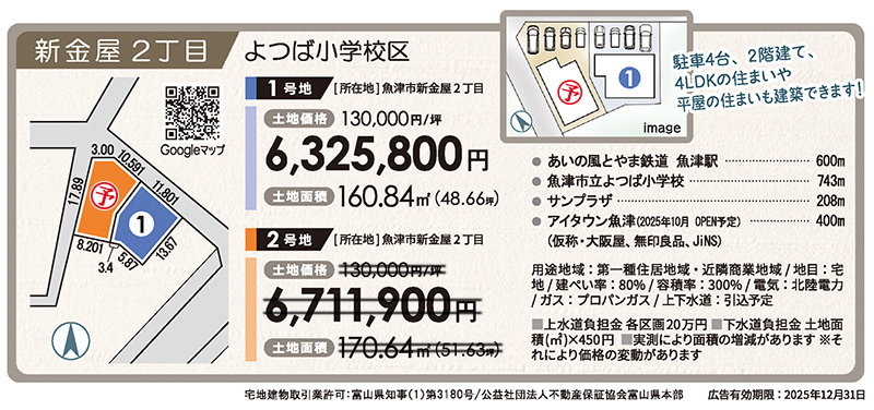 魚津市新金屋2丁目に土地を販売いたしております(建築条件付)。